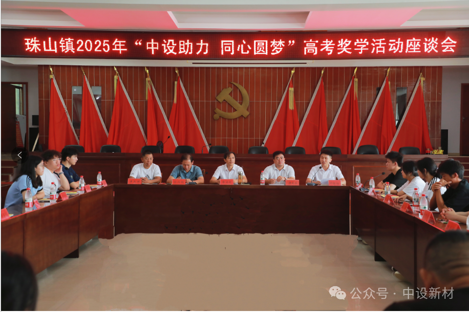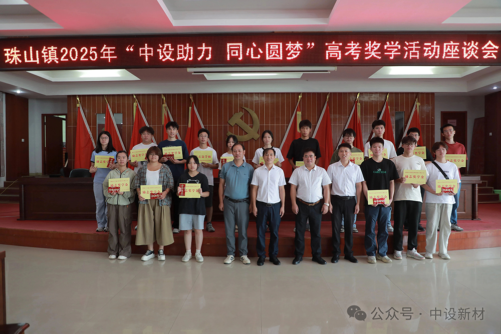 8 月19 日上午,2025 年 “中设助力 同心圆梦” 高考奖学金颁发仪式暨座谈活动在珠山镇政府隆重举行。此次活动由珠山镇人民政府组织,湖南中设新材料股份有限公司(以下简称 “湖南中设”)倾情参与,企业代表与镇领导、25 名优秀学子及家长代表齐聚一堂,共同见证这一承载希望与祝福的重要时刻。
